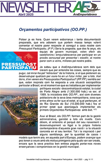 Tot començà al Brazil amb els Orçamentos Participativos, a casa nostre Pressupost Participatiu, com una de les eines que tenen les Administracions per posar en marxa una col·laboració més directa i propera amb la ciutadania, buscant la seva participació i compromís en la gestió municipal. NEWS ABRILv1 PressupostosParticipatius